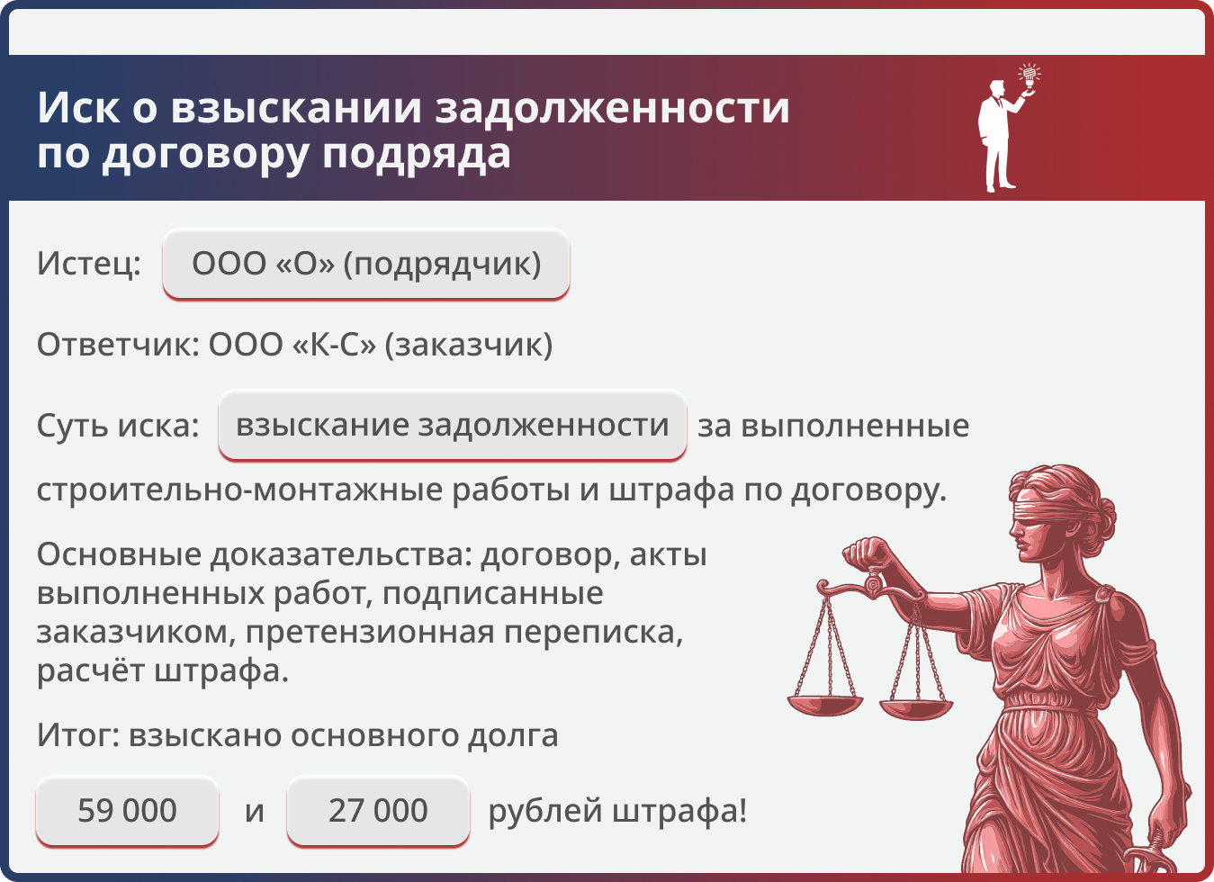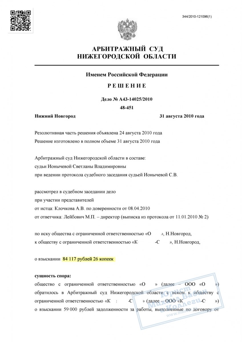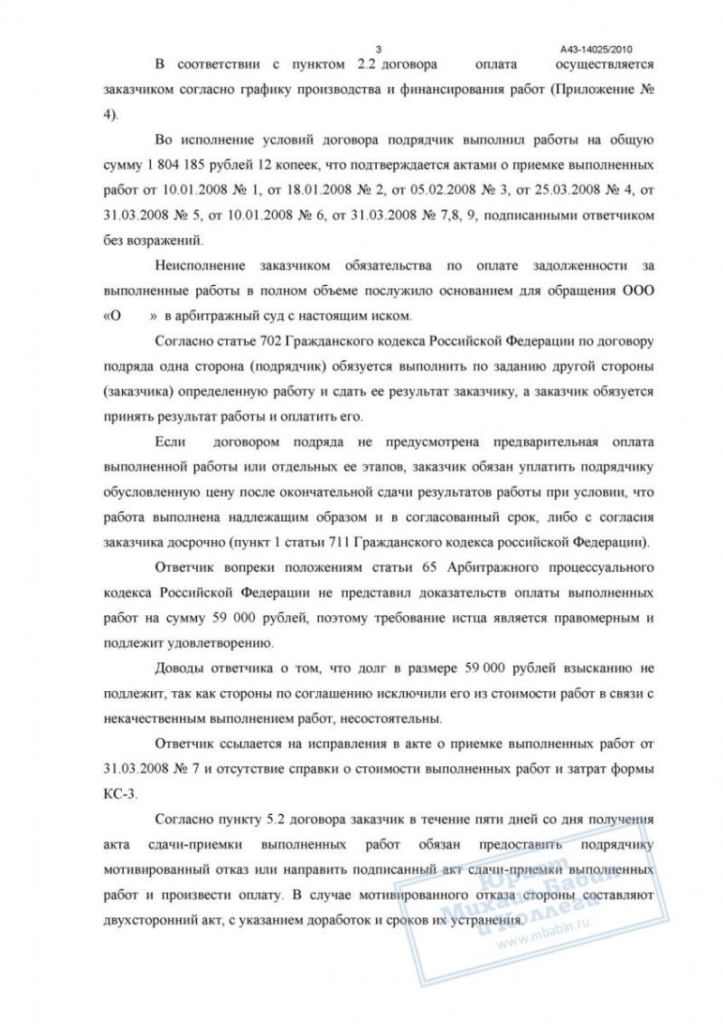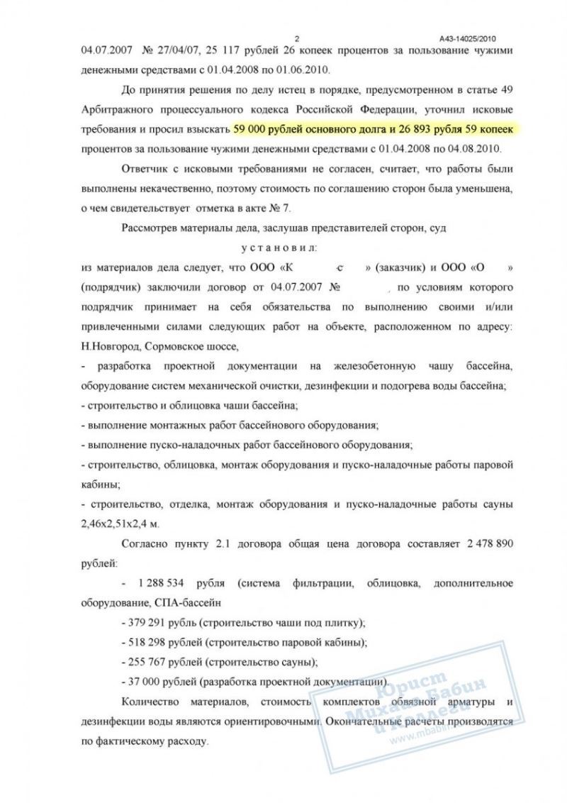 Подрядчик обратился в суд с иском о взыскании недоплаченных 59 000 руб. Юрист коллегии подготовил исковое заявление и собрал доказательства, подтверждающие факт выполнения работ и их приёмку заказчиком. В судебном заседании представитель ответчика пытался обосновать отказ оплаты ссылками на недостатки, однако суд признал эти доводы несостоятельными.