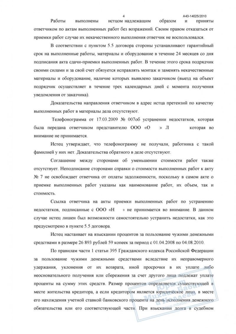 • работы выполнены в полном объёме, что подтверждается актами приёмки, подписанными заказчиком без замечаний;