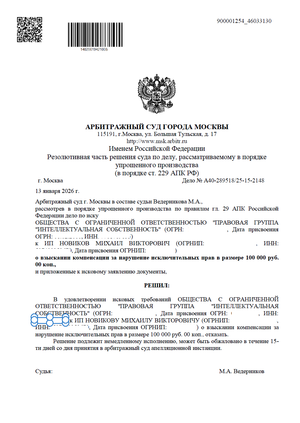 Арбитражный суд г. Москвы полностью отказал ООО «Правовая группа «Интеллектуальная собственность» в удовлетворении исковых требований. Компенсация и судебные расходы истцу не присуждены. Решение вступило в законную силу.