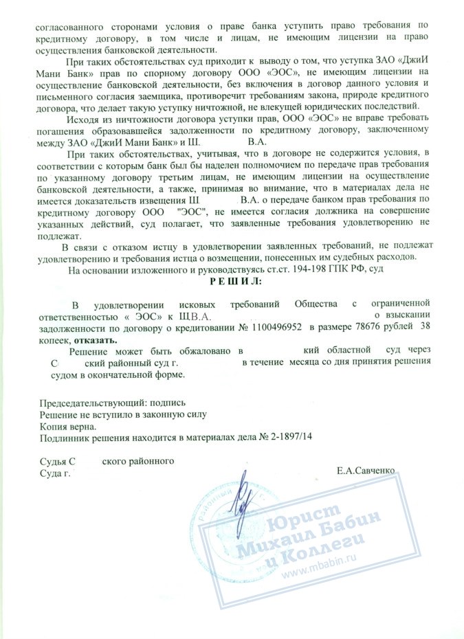 Данные доказательства были озвучены юристом во время судебного заседания и признаны судьей убедительными. В результате ООО «ЭОС» было отказано в праве на взыскание задолженности гражданина Ш.