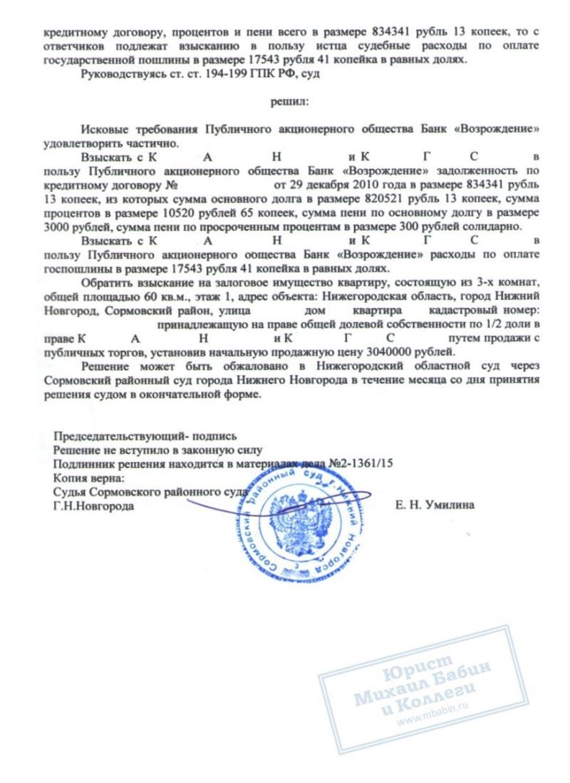 Несколько лет супруги К. выплачивали ипотеку, но начали допускать просрочки выплат - и банк потребовал досрочно вернуть весь оставшийся долг, а именно 1.020.000 руб. Естественно, такой суммой К. не обладали, и задолженность должна была быть возвращена путем ареста и продажи банком их жилплощади. При этом её стоимость была определена всего в 1.680.000 руб. То есть почти все деньги от квартиры должны были уйти на оплату долга.
