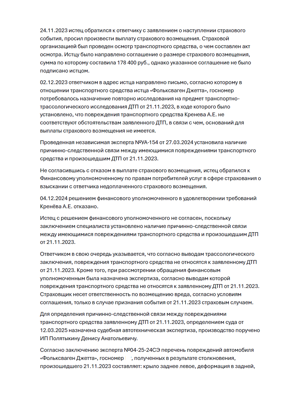 Наш клиент, владелец автомобиля Volkswagen, стал участником ДТП в Екатеринбурге. Виновником аварии был признан водитель другого автомобиля, о чем стороны составили европротокол. Несмотря на это, страховая компания виновника — ПАО СК «Росгосстрах» — после проведения собственного трассологического исследования заявила, что повреждения на автомобиле клиента не связаны с заявленным ДТП, и отказала в выплате. Клиенту было предложено подписать соглашение на сумму 178 400 рублей (без учета износа), но, не согласившись с выводами страховщика, он обратился за юридической помощью.