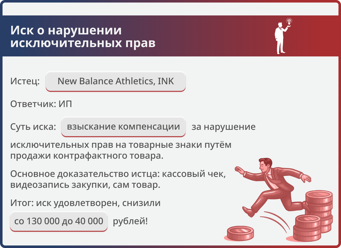 Истец требовал компенсацию за нарушение прав на товарные знаки New Balance. Юристы компании обосновали несоразмерность суммы, и суд снизил компенсацию более чем в 3 раза — до 40 000 руб.
