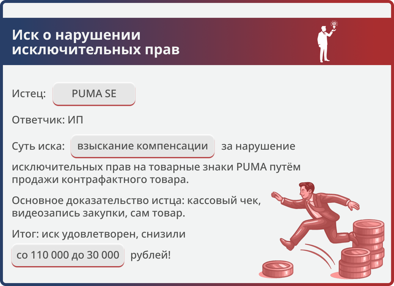 Истец требовал компенсацию за нарушение прав на товарные знаки PUMA. Юристы компании обосновали несоразмерность суммы, и суд снизил компенсацию более чем в 3,5 раза — до 30 000 руб.
