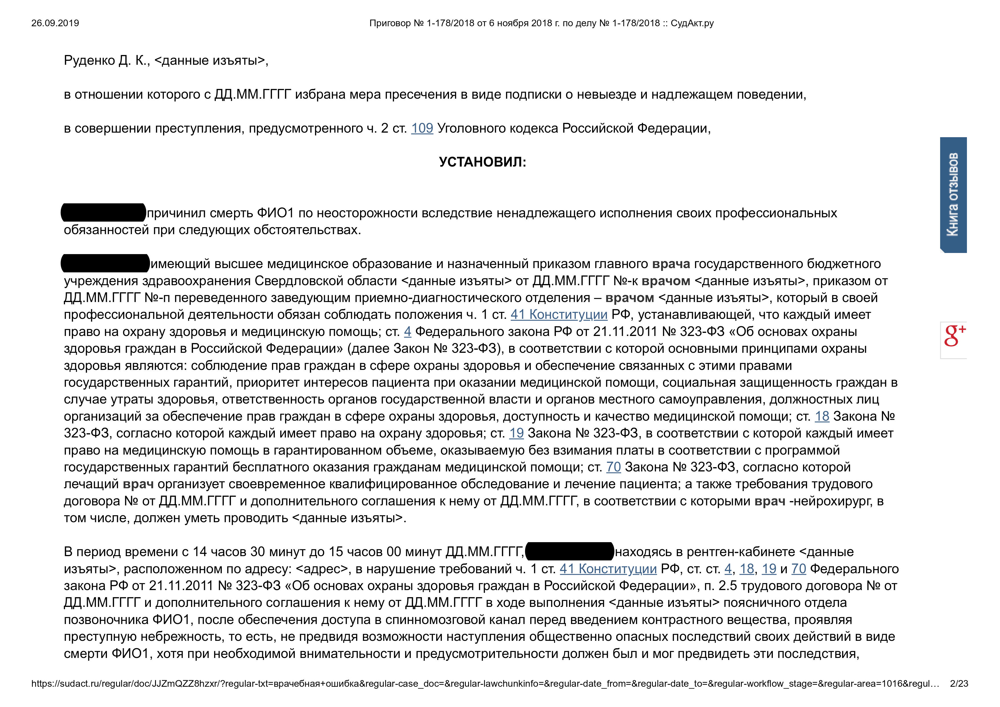 Суд признал врача виновным по ч. 2 ст. 109 УК РФ (причинение смерти по неосторожности). Назначено наказание: ограничение свободы и лишение права заниматься врачебной деятельностью на 1 год.