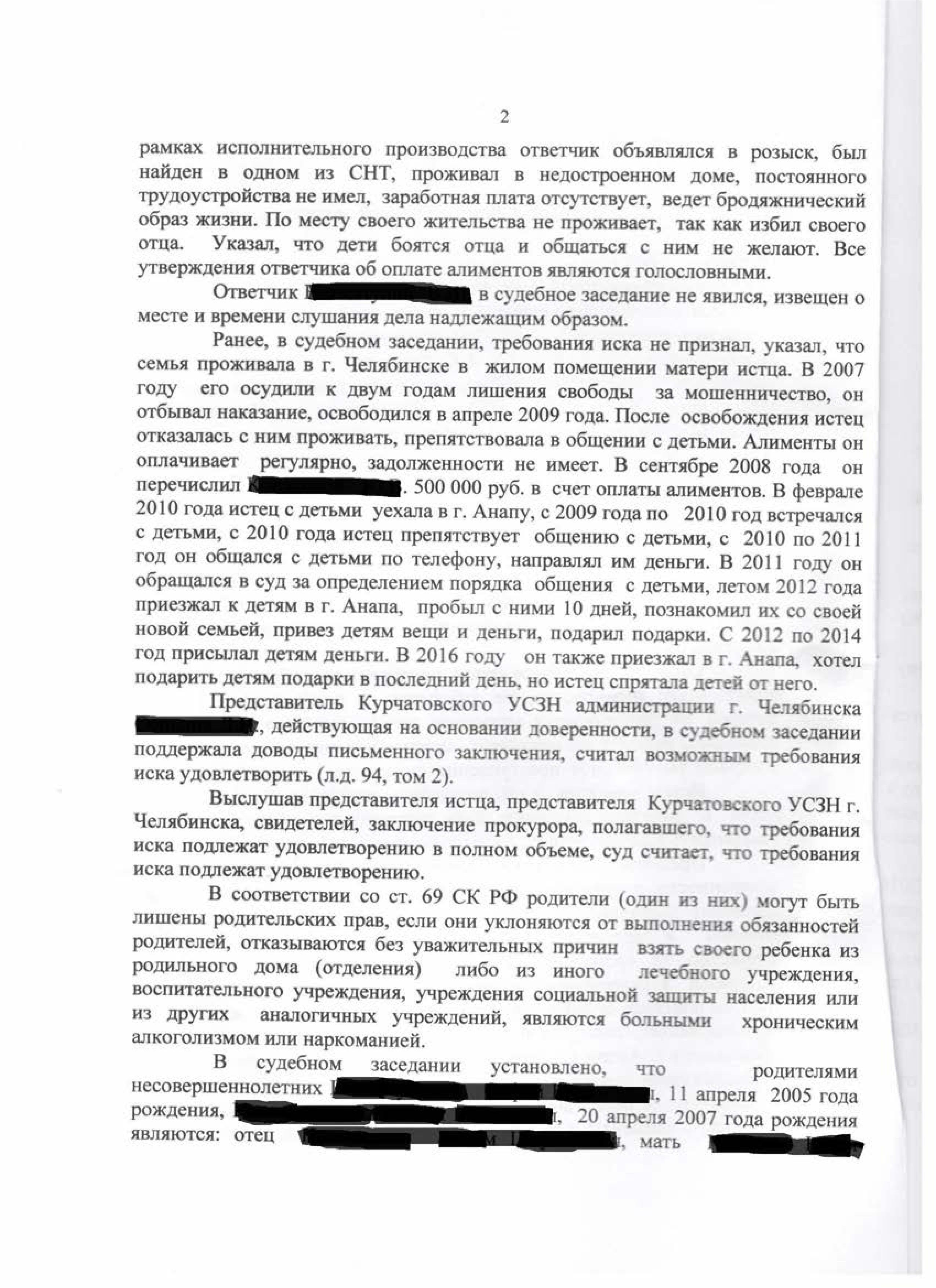 Юрист представлял интересы в данном деле и поддерживал исковые требования о лишении родительских прав и взыскании алиментов. Ответчик в свою очередь заявлял, что перечислял алименты, но с 2010 года после переезда в Анапу мать препятствует его общению с детьми. Материалами дела установлено, что отец приезжал в Анапу, устроил скандал, напугал детей, угрожал зарезать мать и выдать дочь замуж в 13 лет. Суд, рассмотрев все доводы сторон и показания свидетелей, принял решение о лишении отца родительских прав.