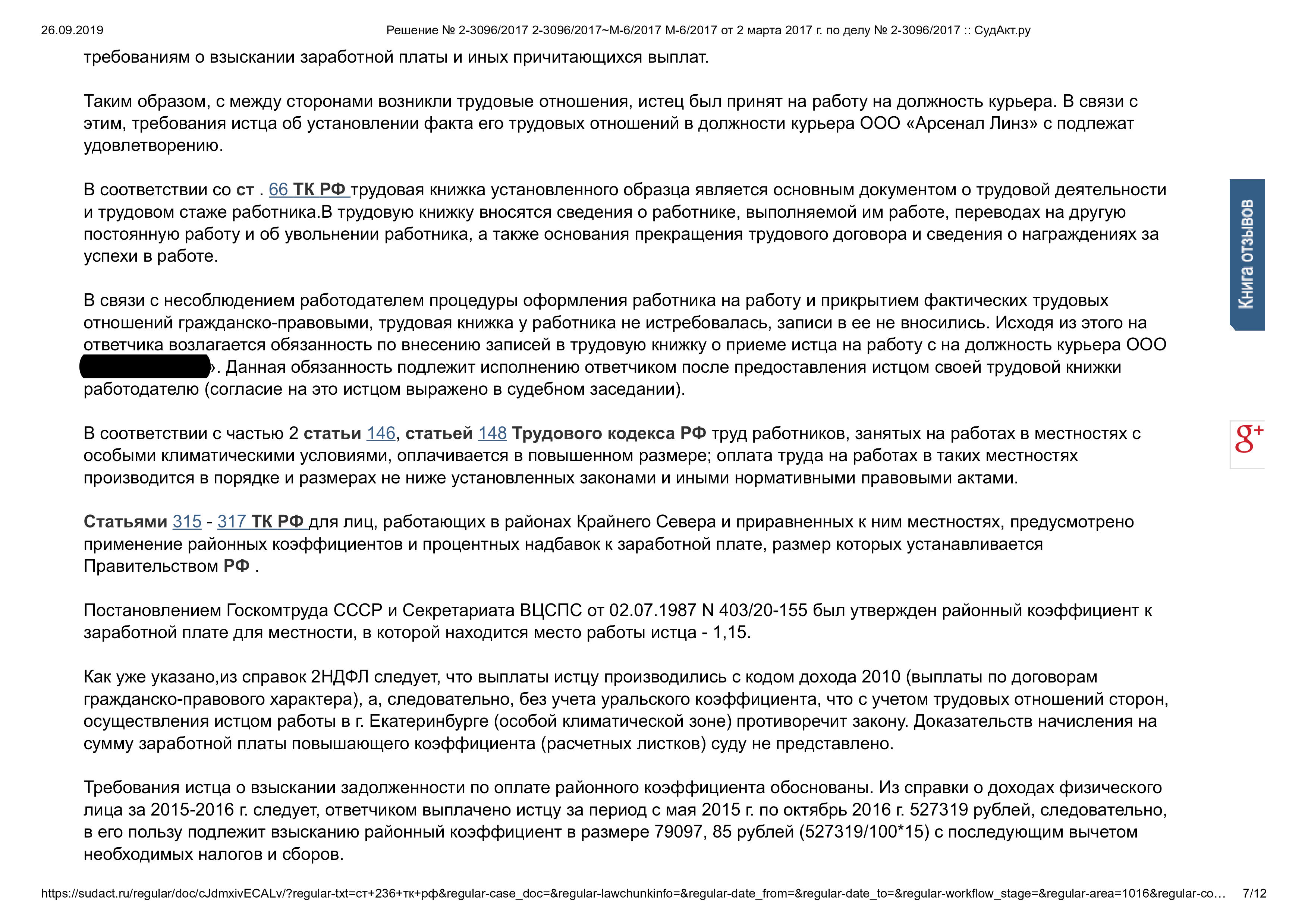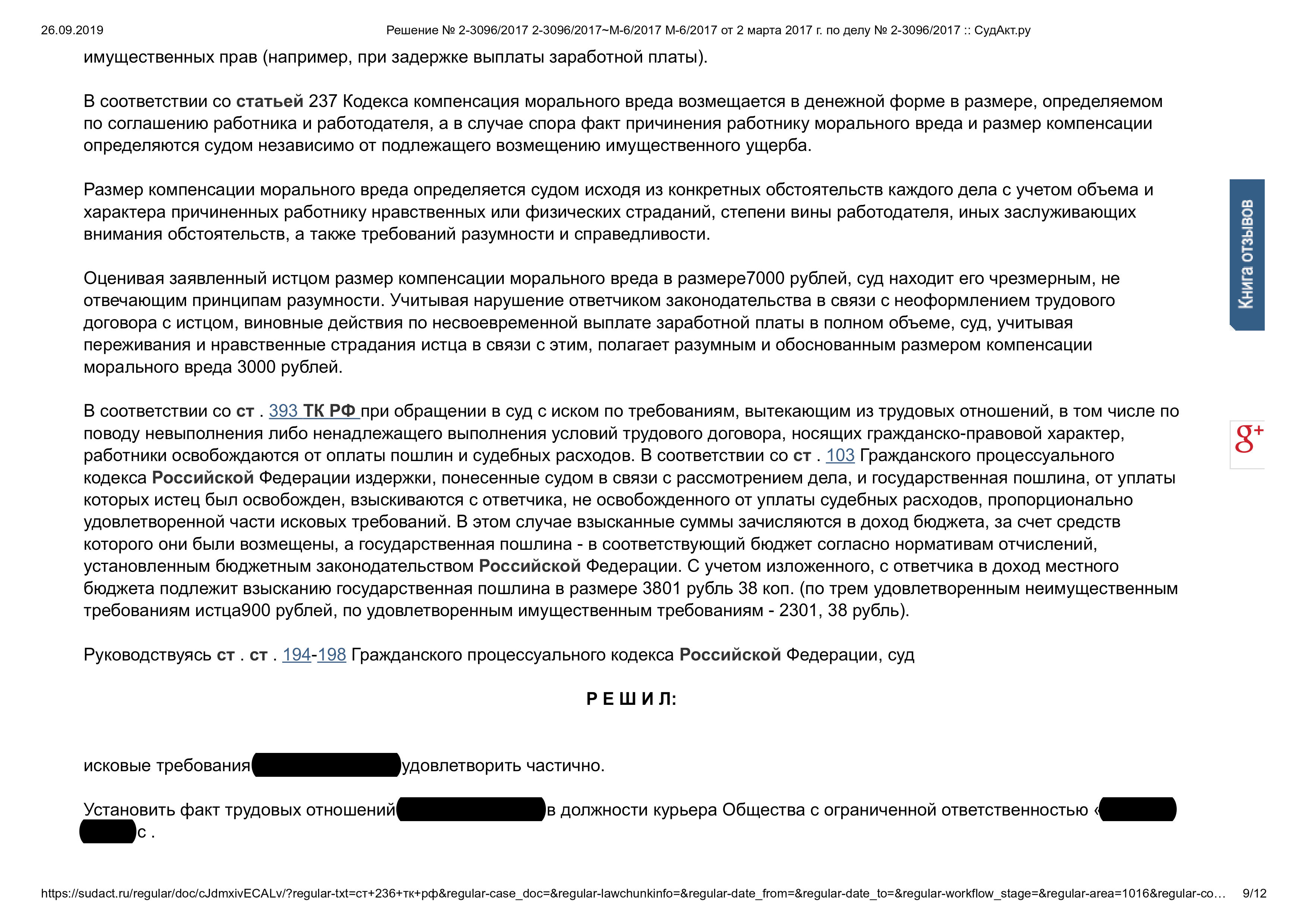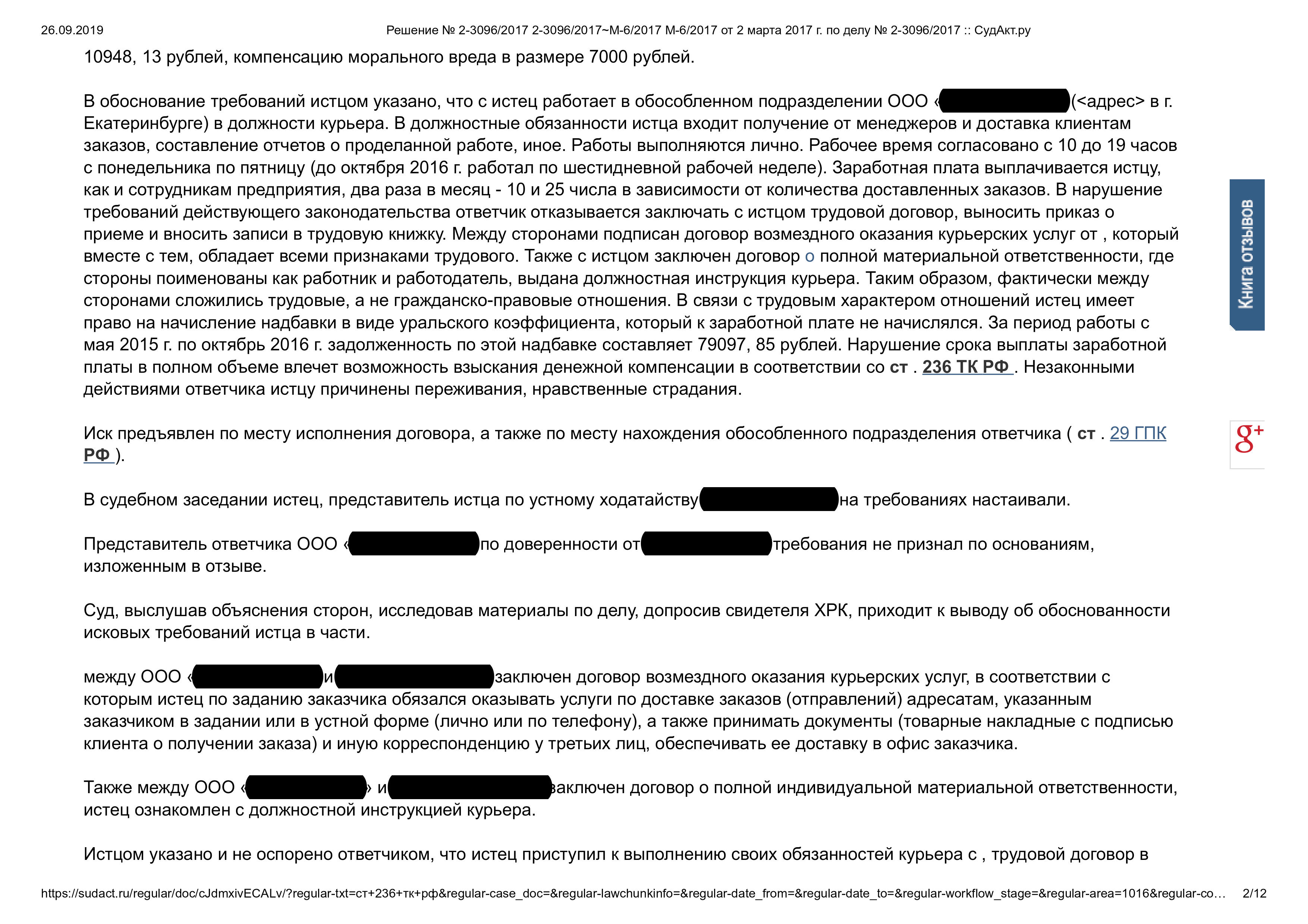 Суд решил обязать ответчика внести в трудовую книжку запись о приеме на работу на должность курьера. Взыскать с ответчика в пользу истца задолженность по заработной плате в размере 79097 рублей 85 коп. (с последующим вычетом необходимых налогов и сборов), денежную компенсацию за задержку выплаты заработной платы в размере 10948 рублей 13 коп., компенсацию морального вреда в размере 3000 рублей.