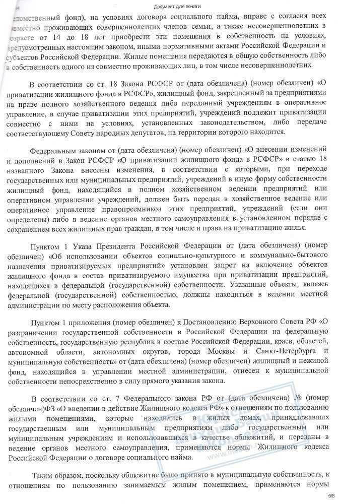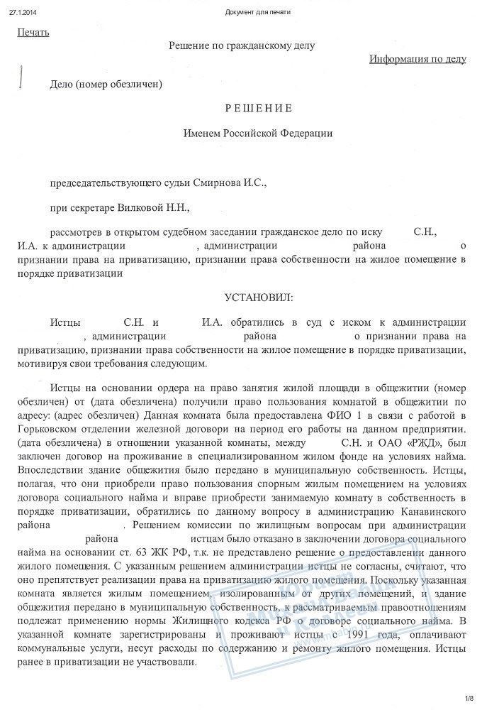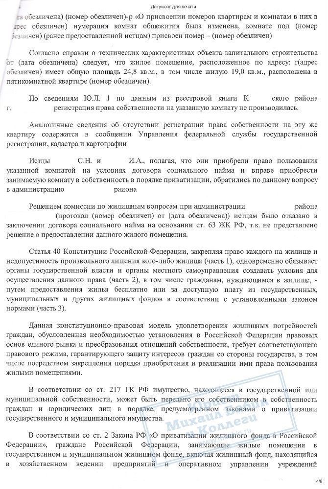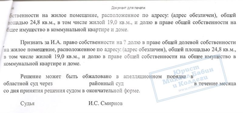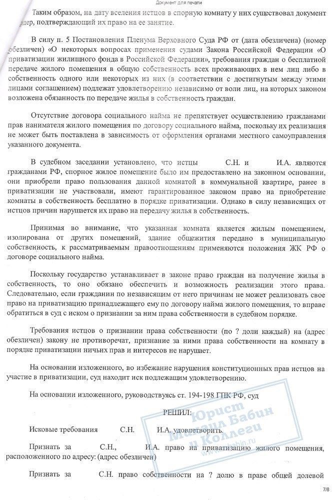 В результате грамотной работы нашего юриста, суд вынес решение о признании за гражданкой К. и ее сыном права собственности на занимаемую комнату по 1/2 доле за каждым.