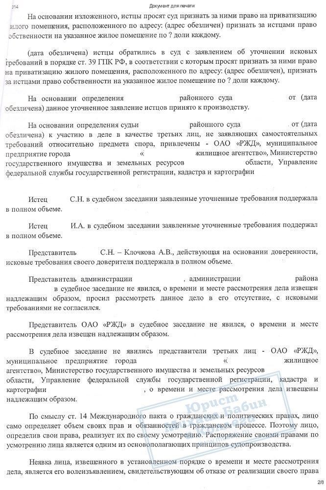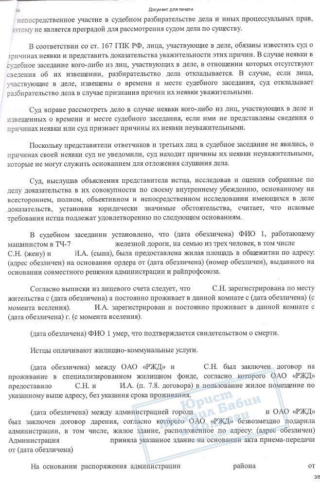 Гражданка К. и ее сын обратились в нашу компанию за помощью в оформлении прав на комнату в общежитии, предоставленную ранее её покойному мужу по месту работы в ОАО «РЖД».